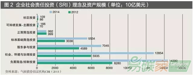 在全球資本市場中,隨著歐美證券市場中綠色可持續(xù)指數(shù)的開發(fā)以及一些大型投資基金對于企業(yè)可持續(xù)發(fā)展的關(guān)注,綠色可持續(xù)發(fā)展行業(yè)已經(jīng)成為一項重要的金融投資產(chǎn)業(yè)。根據(jù)歐洲SIF 統(tǒng)計,截至2014 年,歐洲共有綠色可持續(xù)、社會責任道德等各類主題相關(guān)的綠色投資資產(chǎn)6.7 萬億歐元。全球約有35% 的專業(yè)管理投資資產(chǎn)價值明確了“社會責任投資”(Social Responsible Investment, SRI)的戰(zhàn)略(見圖2)。多家養(yǎng)老基金、資產(chǎn)管理公司等機構(gòu)投資者均確立了擔當社會責任的投資使命。2012—2014 年間,全球社會責任投資資產(chǎn)余額由13.3 萬億美元增至21.4 萬億美元。
