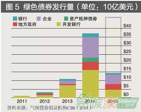 全球綠色債券市場規(guī)模不斷擴大。據(jù)氣候債券倡議機構(gòu)(CBI)的統(tǒng)計,2013 年全球綠色債券發(fā)行總額僅為110 億美元,2014 年為366 億美元,2015 年上半年已增至659 億美元,估計2015 年將達到1000 億美元左右。盡管綠色債券市場發(fā)展較快,但目前其總規(guī)模僅占全球債券市場的0.2%,無法滿足各國環(huán)境投資計劃的資金需求。據(jù)國際能源機構(gòu)(EIA)估計,僅實現(xiàn)“估計,僅實年全球溫度增加不超過2 攝氏度”這一項目標,就需要增加36 萬億美元的投資。綠色債券作為一種新的債券品種,其所募集資金主要用于可再生能源、建筑和工業(yè)、低碳