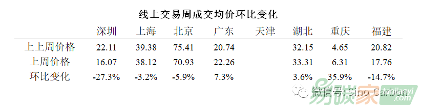 深圳價格接近,在17元/噸左右;重慶價格最低,為6.31元/噸。在連續(xù)兩周發(fā)生交易的區(qū)域市場中,重慶和深圳市場的價格變動幅度較大,其中重慶成交均價較前一周上漲了35%,深圳成交均價較前一周下降了近30%;福建市場上周平均價格略有回落,降幅在15%左右;上海、北京、廣東、湖北的市場價格表現(xiàn)相對穩(wěn)定,平均價格與前一周基本持平。上周天津配額市場線上無成交。