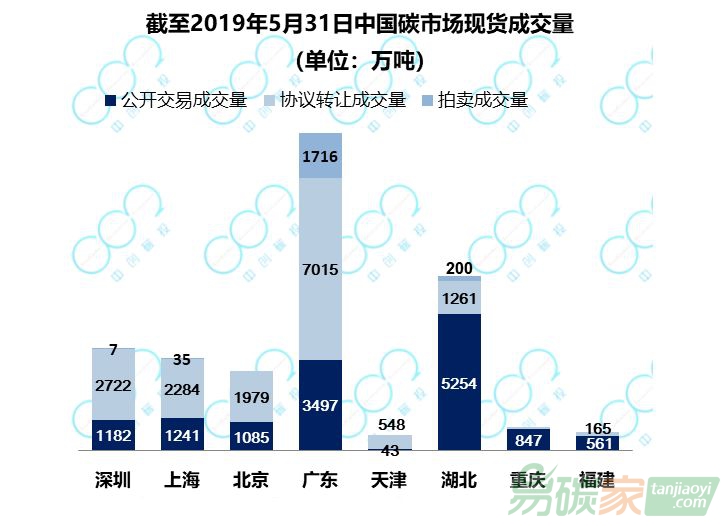 截至2019年5月31日,一、二級現(xiàn)貨市場累計成交量約3.2億噸,成交額69.2億元。廣東、湖北成交量最高,位于第一梯隊;深圳、上海、北京位于第二梯隊;而天津、重慶、福建的成交量相對較低,位于第三梯隊。