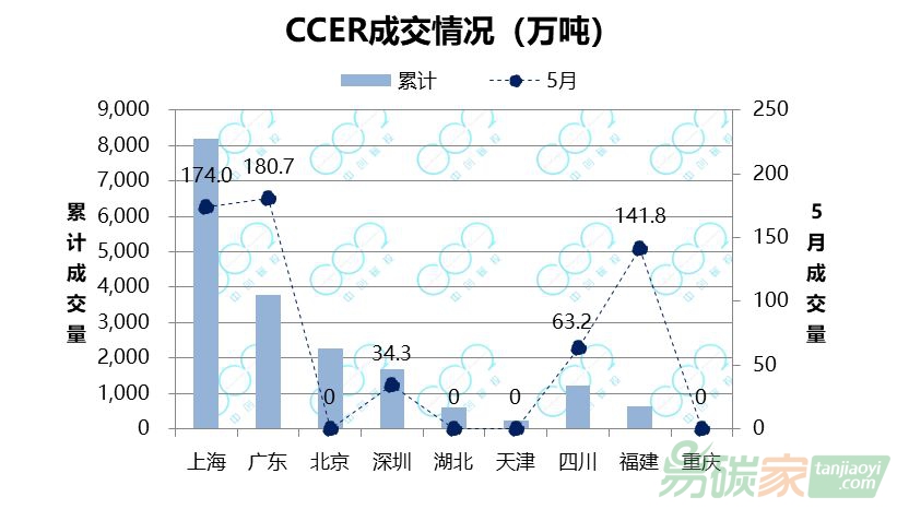 截至2019年5月31日,9個備案的交易所共成交CCER 1.87億噸,其中上海成交8178.6萬噸,占比約44%。5月,上海、廣東、深圳、