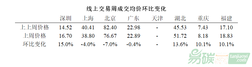 在連續(xù)兩周發(fā)生交易的區(qū)域市場中,上周各市場成交價(jià)格表現(xiàn)均比較穩(wěn)定,其中廣東價(jià)格與上一周持平,深圳、湖北上漲約了15%,重慶、福建上漲了10%,北京、上海價(jià)格有所回落,降幅均在10%以內(nèi)。上周天津配額市場無成交