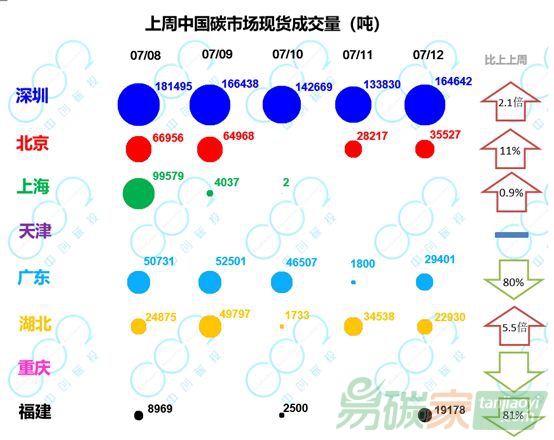 2019年7月8日-7月12日,湖北CCER市場(chǎng)表現(xiàn)最為活躍,共計(jì)成交4.4萬(wàn)噸;其次為上海和