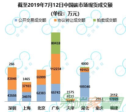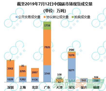 截至2019年7月12日,8個(gè)區(qū)域碳市場(chǎng)一、二級(jí)現(xiàn)貨市場(chǎng)累計(jì)成交3.42億噸,總成交額73.98億元。廣東、湖北成交量最高,位于第一梯隊(duì);深圳、上海、北京位于第二梯隊(duì);而天津、重慶、福建的成交量相對(duì)較低,位于第三梯隊(duì)。