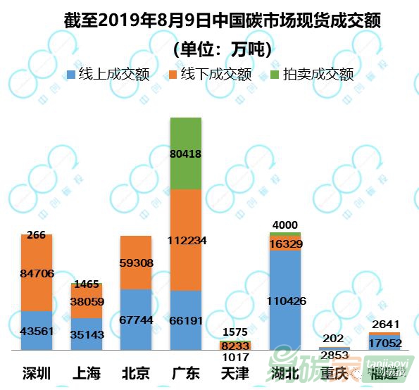 截至2019年8月9日,8個(gè)區(qū)域碳市場(chǎng)現(xiàn)貨累計(jì)成交3.47億噸,總成交額75.34億元。廣東、湖北成交量最高,位于第一梯隊(duì);深圳、上海、北京位于第二梯隊(duì);而天津、重慶、福建的成交量相對(duì)較低,位于第三梯隊(duì)。