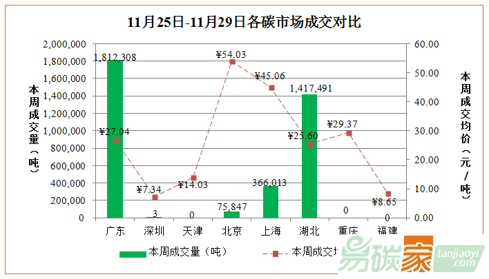 北京碳市場本周成交配額7.58萬噸,成交均價54.03元/噸,較上周上漲10.06%;