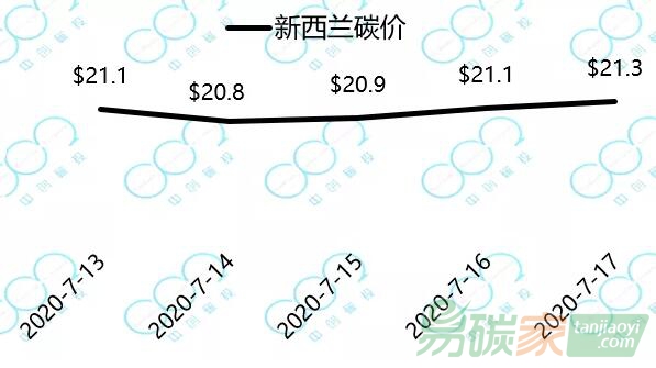 2020年7月13日至7月17日,新西蘭碳價(jià)在20.8-21.3美元每噸之間小幅波動(dòng)。