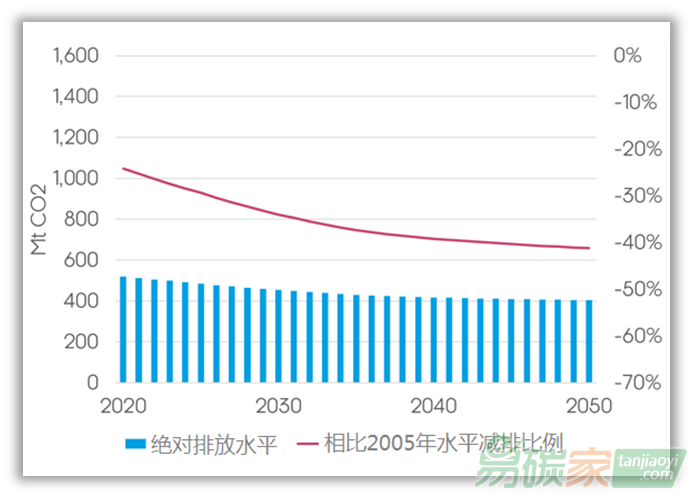 到2030年公路交通排放預(yù)計(jì)將比2005年水平低14%左右;而建筑物(主要為采暖)排放將比2005年水平低34%。到2050年公路交通和建筑排放預(yù)計(jì)分別低于2005年水平的37%和41%,絕對(duì)CO2排放分別略高于5.5億噸和4億噸。